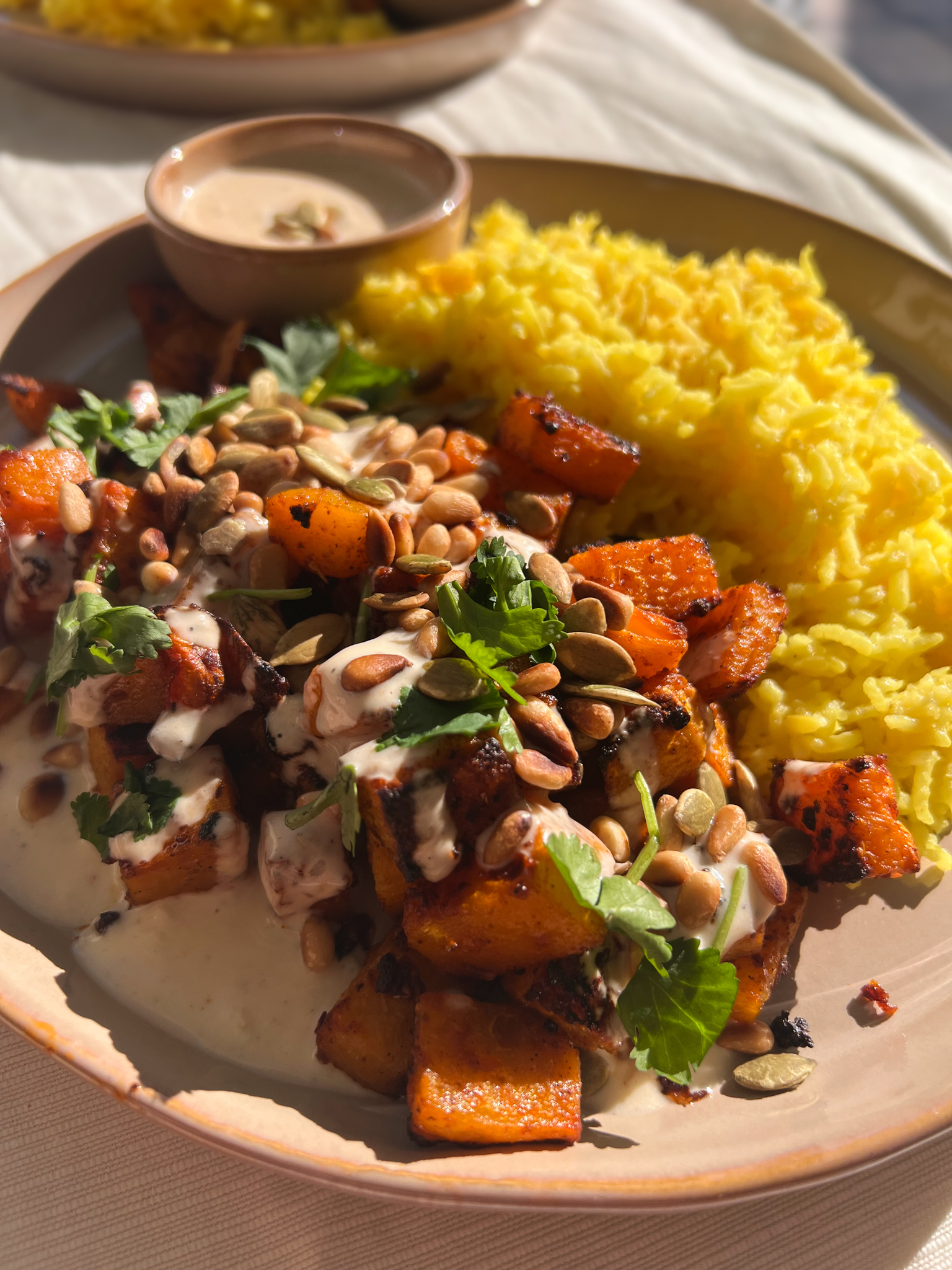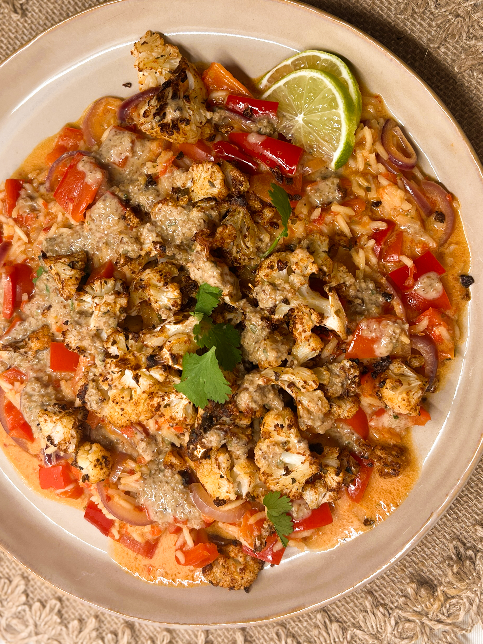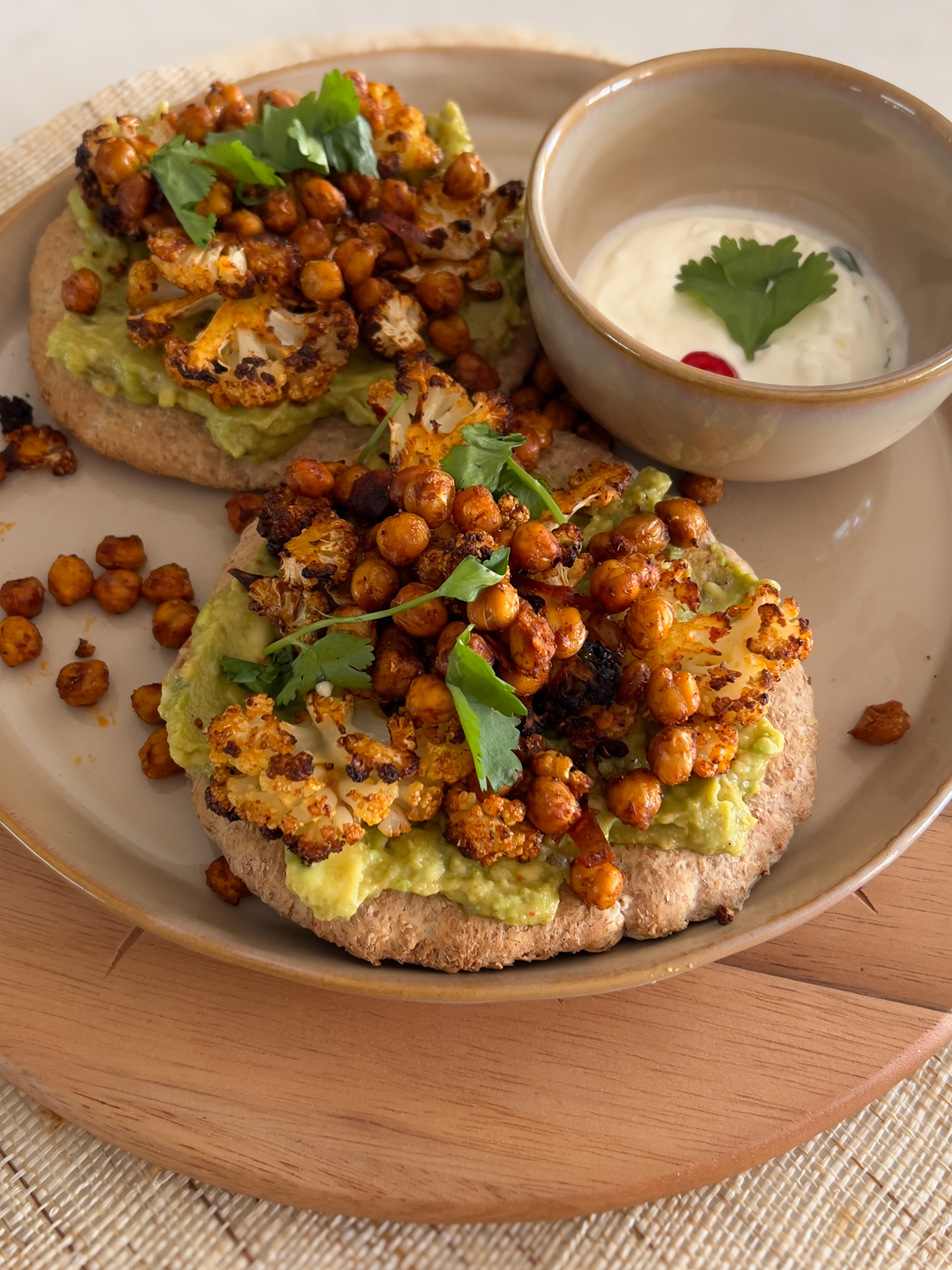 Krokante citroen feta met gekruide kikkererwten en basilicum orzo