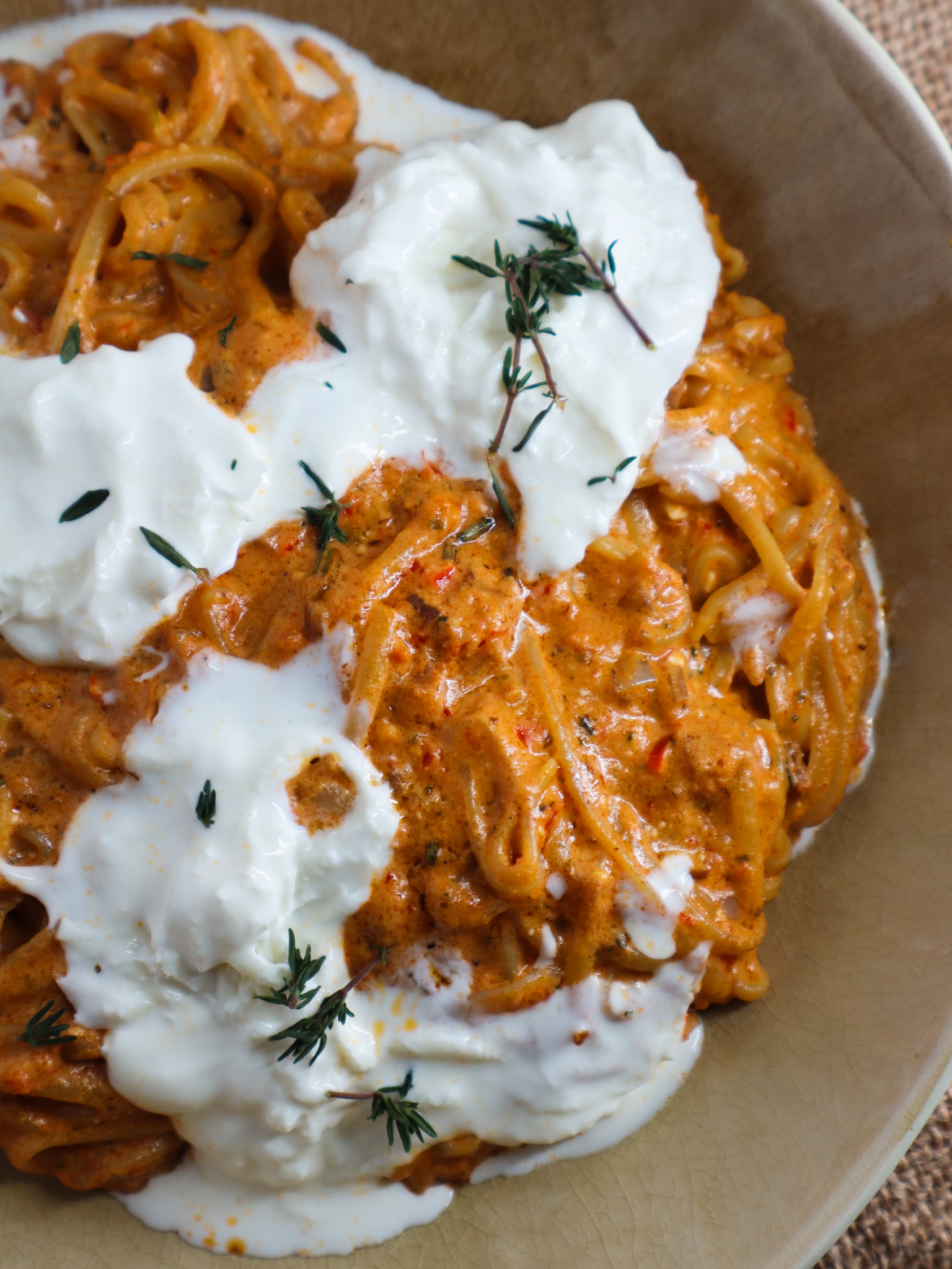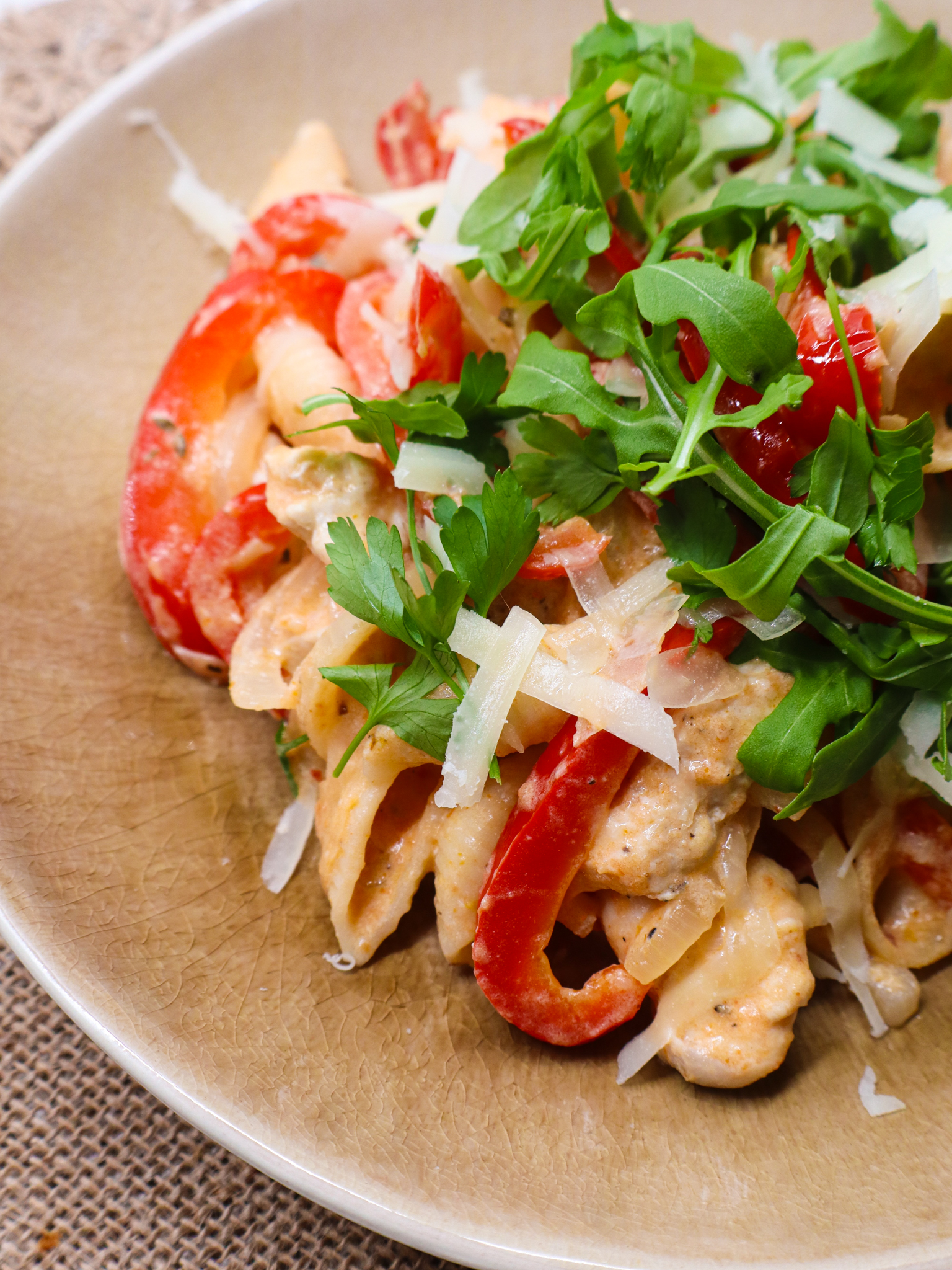 Romige knoflook pasta met parmezaanse kaas en rucola