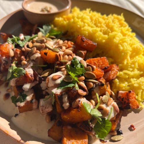 Serveer de pompoen op een serveerbord en besprenkel met de knoflook-roomsaus. Schenk wat olijfolie erover en bestrooi met sumak, de pijnboompitjes en koriander. Serveer met jouw bijgerecht. Geniet!
