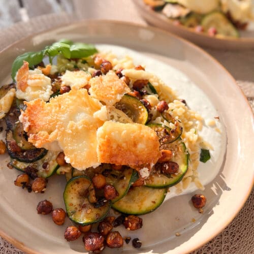 Roer dan in een kleine kom de yoghurt, citroensap, 1 teentje knoflook en een snufje zout en peper door elkaar. Verdeel dan de yoghurt over de borden en schep de orzo, kikkererwten en knapperige feta daarbovenop. Garneer met verse kruiden. Geniet!