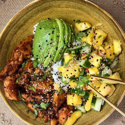 Verdeel de sushirijst over de borden en schep de kip hierover. Voeg de mango salade toe en leg de avocado mooi neer. Top af met sesamzaadjes en chilivlokken. Geniet!