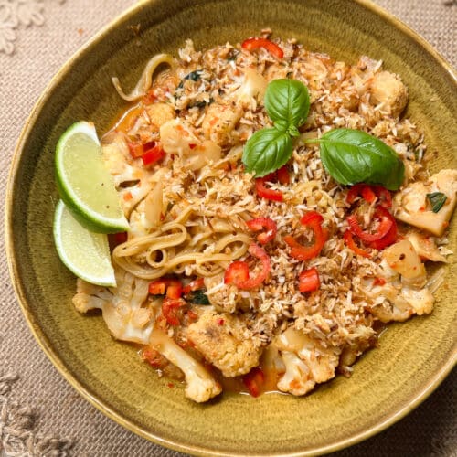 Giet dan de kokosmelk, coconut aminos en honing erbij. Breng het mengsel aan de kook, kook 5 minuten of tot de saus iets dikker wordt. Als de saus te dik wordt kun je wat extra water toevoegen. Haal van het vuur en roer de limoensap en de basilicum erdoor. Bewaar wat basilicum voor de garnering.