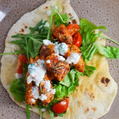 Bedek de tortilla's met sla, tomaat, avocado, kip en de feta saus. Geniet!