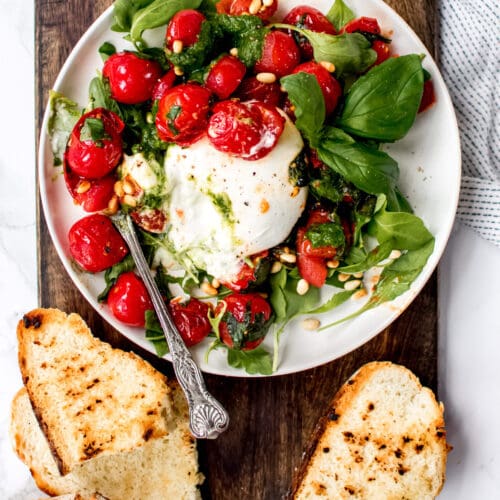 Meng in een grote ondiepe schaal extra vierge olijfolie, rode wijnazijn, ui, basilicum, peterselie en zout en zwarte peper door elkaar. Voeg gesneden tomaten toe en meng om ze in de marinade te coaten. Laat in de koelkast marineren zolang je tijd hebt (het beste is 's nachts, maar ook met een uurtje is de smaak al verrukkelijk).