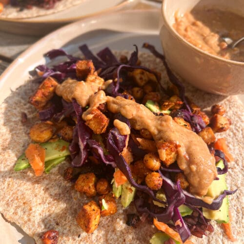 Schep wat van de rijst op de tortilla om een basis te creëren, voeg dan de avocado en de groente toe. Top af met de tofu en giet daarover de heerlijke pindasaus. Serveer nog wat extra pindasaus om lekker in te dippen tijdens het eten.