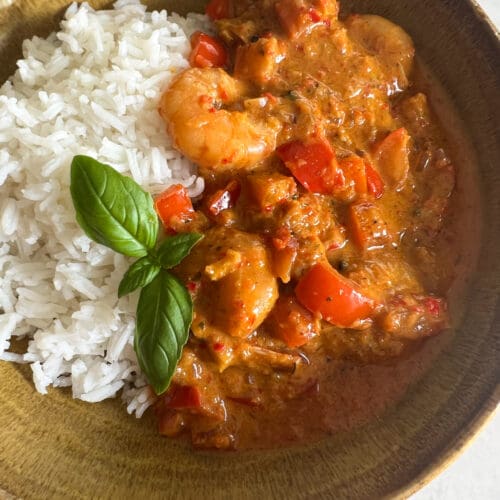 Voeg limoensap, sambal en basilicum toe. Voeg de garnalen toe en laat ze niet langer dan 1 minuut sudderen. Garneer met de ingredienten naar keuze en serveer met de rijst. Geniet!