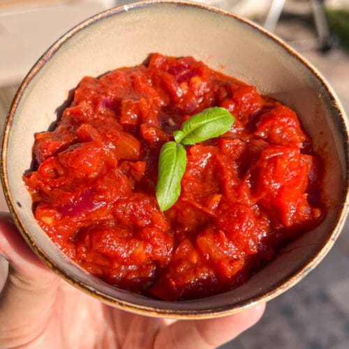 Voeg tot slot de gezeefde tomaat toe en laat 20 minuten lekker indikken op middelhoog vuur. Giet in een mooi schaaltje en laat afkoelen voor gebruik.
